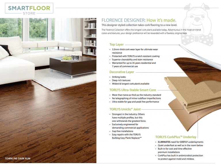 The design of an engineered floor is to combine a stable core backing with an aesthetic top (called a lamella). This design will play a major role in the durability and performance of the flooring. Generally speaking, the top layer should always be thinner than the bottom layer. Torlys Smart Floors makes a proprietary style of backing called CorkPlus™ , which is made from multiple ply’s and it offers a warm, quiet, underlayment. Engineered cork flooring can also have some additional features built in to enhance the performance. In the case of Torlys Smart Floors, you’ll find gap and peak free construction build into each plank. Download the complete spec sheet below for more information.