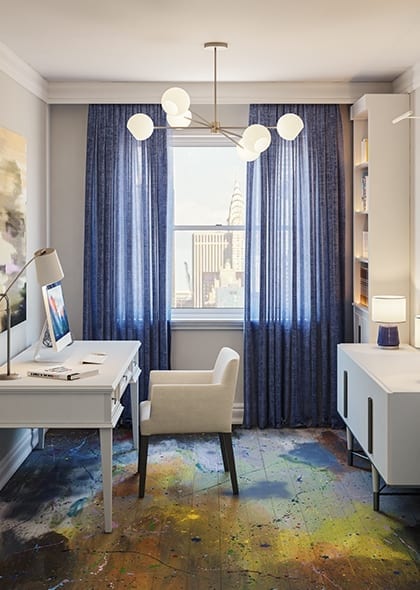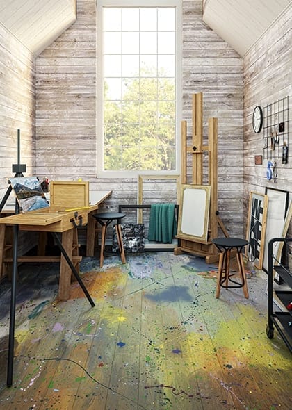 I think with this group; we try to work backward. Envision a floor and then try to put it in a room. For this White Oak flooring, that was easy. The photo of the floor in an art studio is the result of the creative process …. unintentional art, which we all liked. Then we wanted to see what it looked like in a home and if the concept might transition into real life. I think it looks cool. Certainly not for everyone, but that’s the idea.