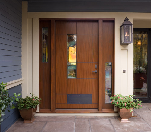 Now that you know it’s beautiful getting to your home, it is time to where people get into your home by updating your front door. The goods news…there are tons of ways to update your front door to give it a look that complements your home. You can find something colorful and eclectic, clean and modern door, or something totally unique like the one below. This Craftsman-Style Michigan home uses a front door made from wood, windows, granite as a toe kick, and an interesting pattern of intersecting lines.