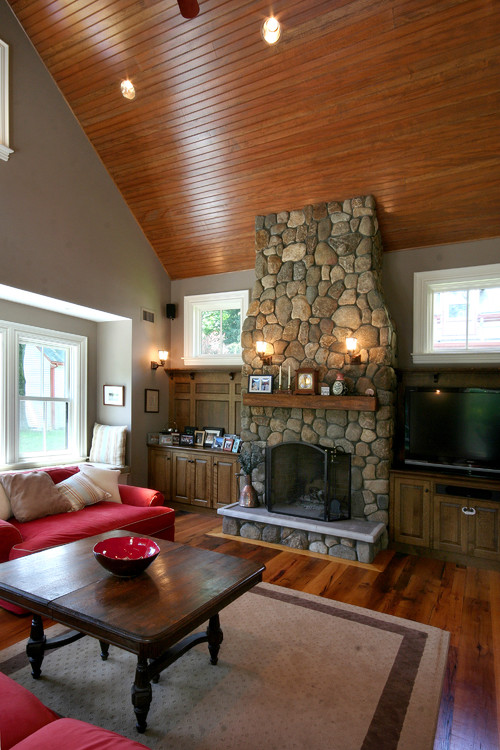 This Boston Family Room has a decorative wood beam installed within the stonework, to store treasured family heirlooms.